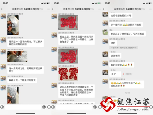 一份简单的底稿、一张红红的宣纸、一把小小的剪刀,小朋友们在家里也可以体验美妙的剪纸游戏。孩子们利用前期报名发放的材料、在非遗剪纸苏老师的视频讲解和志愿者们的温馨提示下,将传统剪纸艺术与虎年新春相结合,完成一幅幅“虎虎生威”的剪纸作品。随后,志愿者通过剪纸知识小问答,让孩子们了解到民间剪纸艺术,在剪纸过程中感受剪纸技艺和传统文化魅力。孩子们逐一分享其剪纸成品与感受。