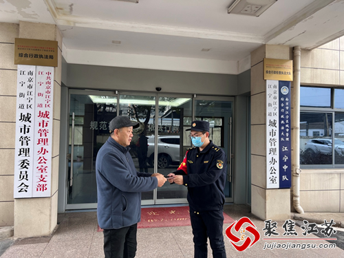 2月19日上午,在南京市江宁区江宁街道城管办门前,城管队员将捡到的手机交到失主手里,演绎暖心助人的一幕。