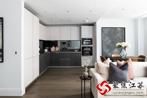 这个厨房给人的第一印象就是“很搭”,整体设计采用的是现代简约风格,不管是地板还是墙面,在颜色上与防治主色调都是相呼应搭配的,让人看着就是舒服协调的感觉。白色的橱柜与门都给人一种整洁干练的印象,没有传统厨房的杂乱,显得井井有条,很自然。