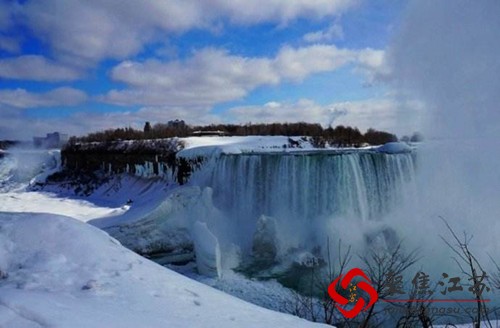 由于严寒天气的影响,位于加拿大一侧的尼亚加拉大瀑布被部分“冰封”,昔日湍急的瀑布形成一条条冰柱,挂在悬崖之上。飞溅的浪花、水雾和冰挂交相辉映,景象壮美。