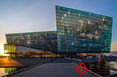 音乐厅无论是外观还是内部的设计都非常的精美,它的设计灵感来源于 冰岛 神秘莫测的 北极 光。面墙是由蜂窝状的玻璃块组成的,上千块不规则的几何玻璃块随着光影的变换而变化着不同的颜色。
